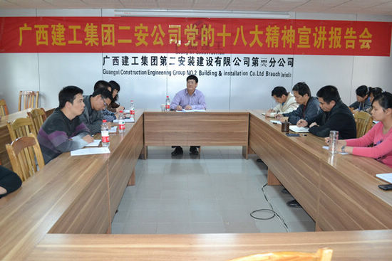 集團(tuán)副總經(jīng)濟(jì)師、二安公司黨委書記劉傳海,在公司柳州長豐路基地向第一、第四、第六分公司黨員、職工進(jìn)行宣講。公司黨委副書記、紀(jì)委書記、工會主席羅振中在公司會議室向公司機(jī)關(guān)、第三分公司、直屬分公司黨員、職工進(jìn)行宣講。講述了理解十八大精神的重要關(guān)鍵點(diǎn)、十八大的重要成果等內(nèi)容,傳達(dá)了在今年召開全國兩會上習(xí)近平同志、李克強(qiáng)同志關(guān)于貫徹落實(shí)十八大精神的重要講話。并與黨員、職工開展互動交流,探討了貫徹落實(shí)十八大精神改善職工民生、推進(jìn)公租房建設(shè)、工資制度改革、轉(zhuǎn)變工作作風(fēng)、提高工作效率等問題。宣講會結(jié)合實(shí)際,生動活潑,受到廣大黨員、職工歡迎。